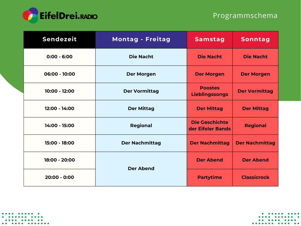 Hier ist unser Programmschema. Mehr Details zu den einzelnen Sendungen kommen in Kürze.